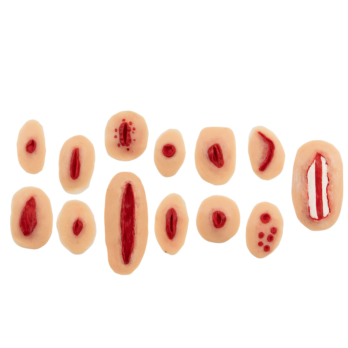 The set includes 26 adhesive wound practice modules suitable for application on various regions of the body on manikins or live individuals.